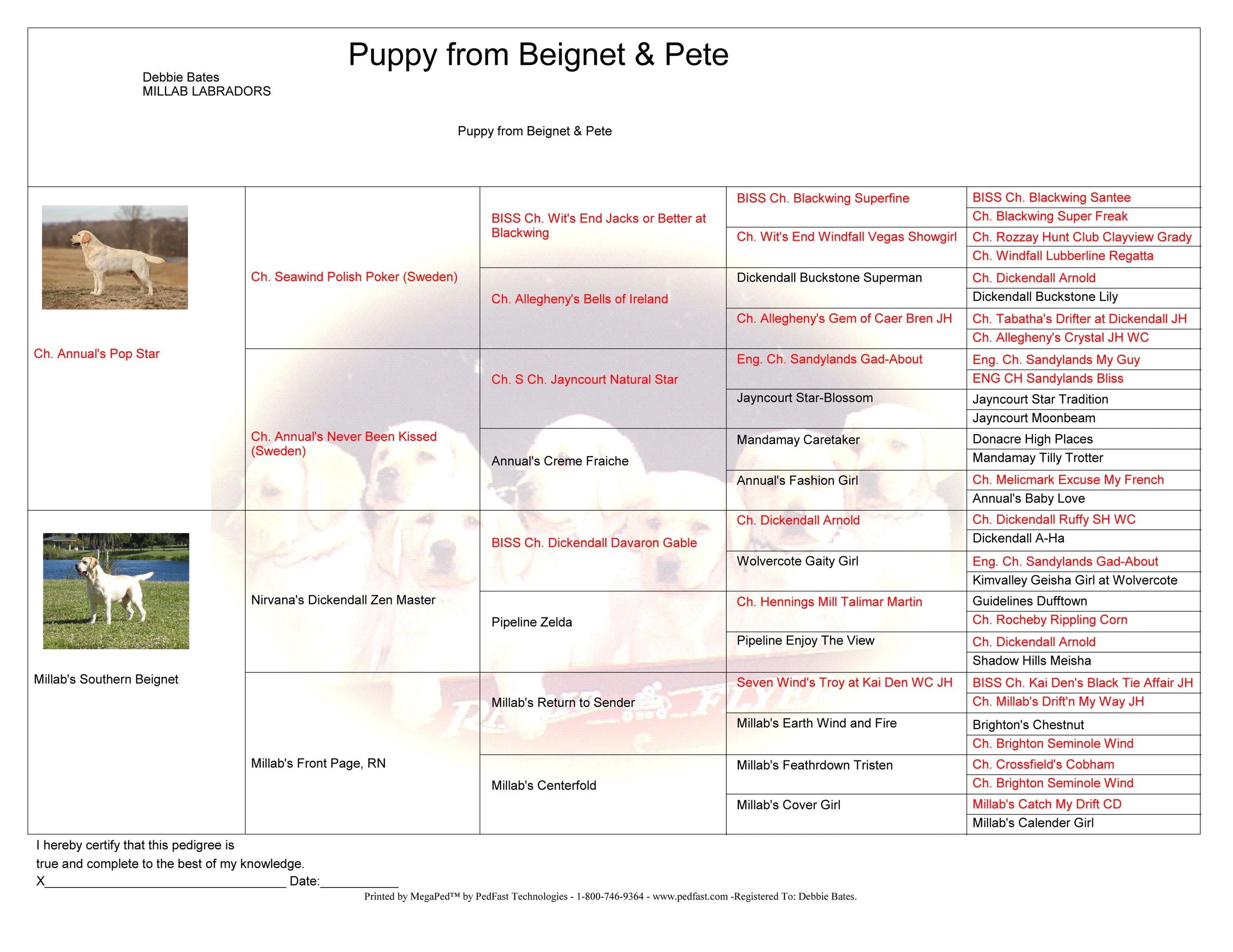 The Millab prefix began in 1970 with a litter out of Marge Miller's first girl Cinder, whose pedigree went back to Dual Ch. Shed of Arden, Dual Ch. Cherokee Buck, Fld. Ch. Hiwood Mike and Ch. Labcroft Mr. Chips. She was bred to a Shamrock Acres dog and Marge discovered that line to have the 'look' she loved.